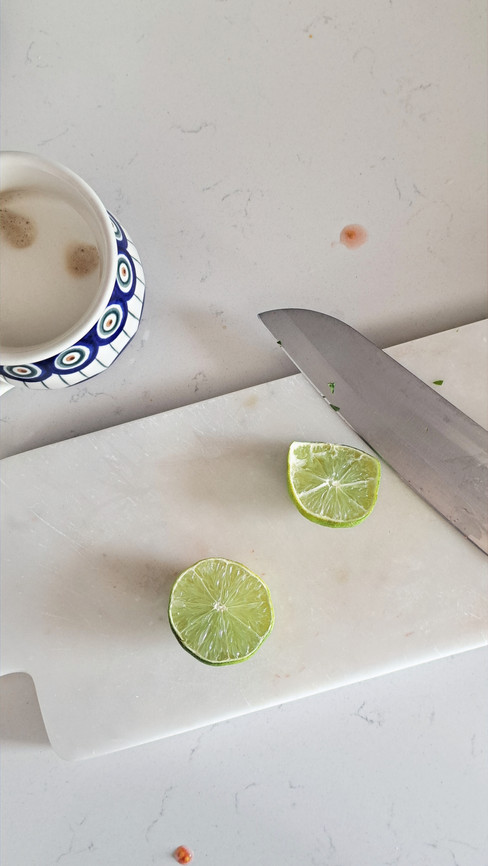 Pora na zielone - pokrój, lub podrzyj listki bazylii i mięty i wrzuć na patelnię, delikatnie przemieszaj, po czym skrop całość sokiem z limonki. Idealnie jeśli masz świeże pieczywo - możesz posmarować je masłem, jako dodatek do "halloumicy", która świetnie smakować będzie również z grzanką. Możesz również - jak ja - przełożyć wszystko na bułeczkę i nie przejmować się tym, że podczas zajadania, połowa znów wyląduje na talerzu (oby nie na spodniach!)